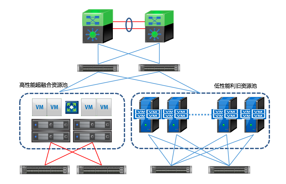 基于深信服企业级云的超融合架构,高性能资源池承载核心关键应用,利旧资源池承载非关键业务。